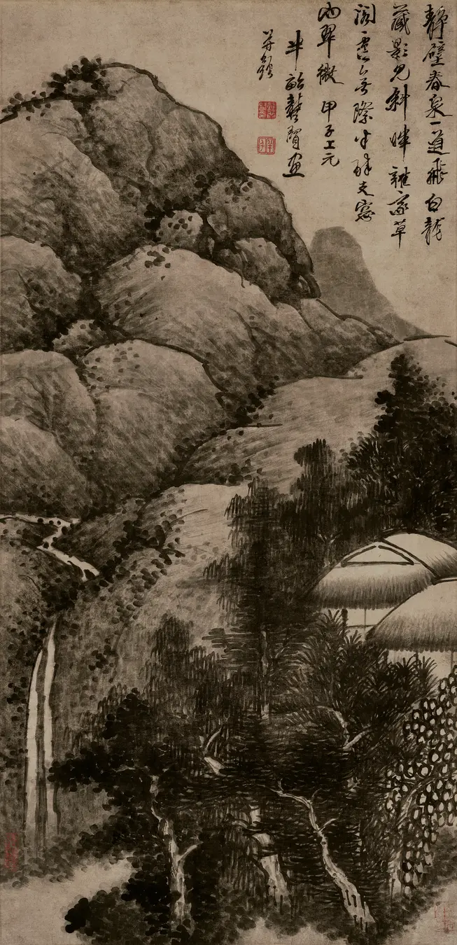 欣赏这幅画时,可以首先关注画面整体的墨色层次与氛围。龚贤通过独特的“积墨法”,使山石显得厚重苍润,林木蓊郁。画面中央的飞泉是视觉焦点,留意画家如何用留白表现水流,并与周围浓墨的山岩形成虚实、动静的对比。这种对比不仅塑造了空间深度,也传达出一种静谧中蕴含生机的自然韵律。试着感受画面沉郁苍茫的意境,体会画家寄情山水、孤高自守的精神世界。