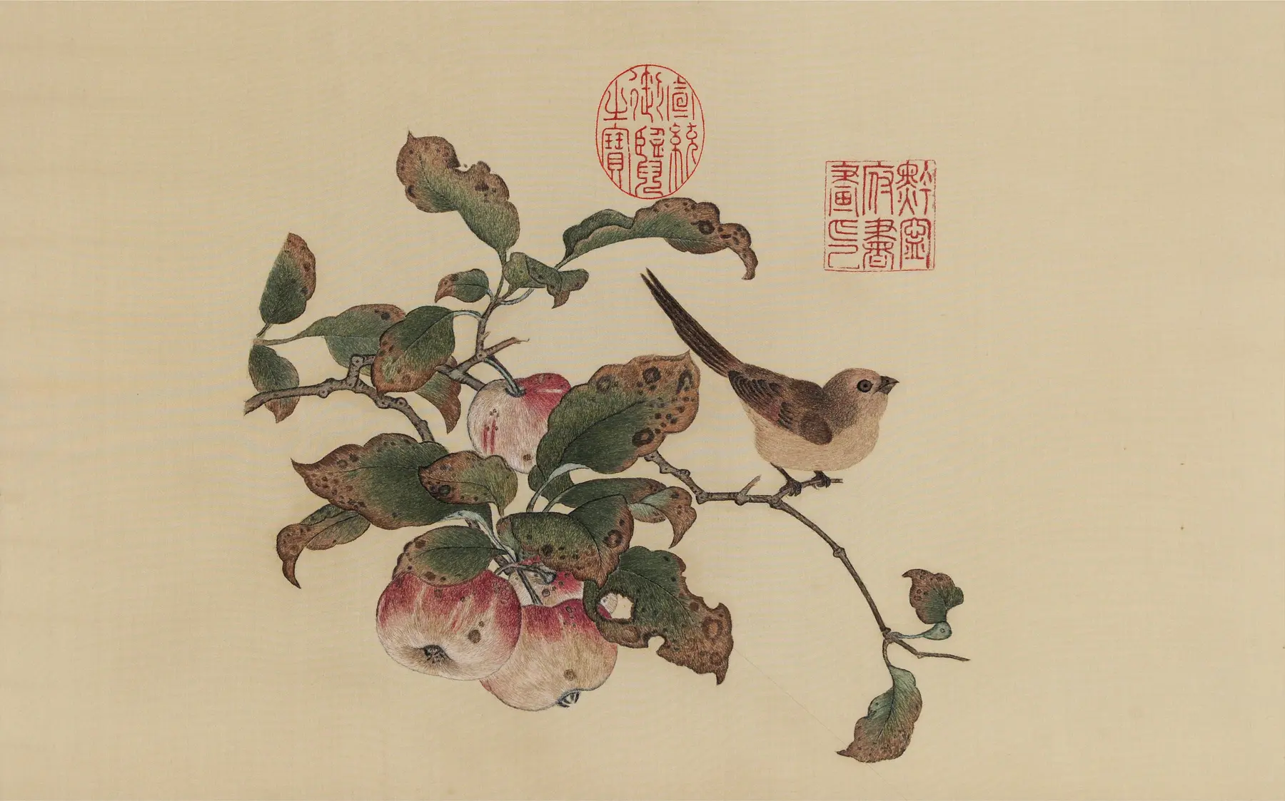 画面以苹婆树为主体,山鸟栖息其间,构图简洁而集中,注重物象的形态与色彩表现。