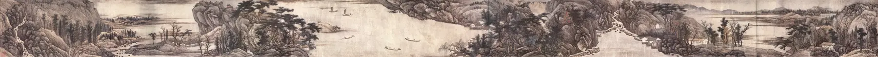 采用横向展开的长卷构图,画面随卷轴展开呈现连续的山水空间。