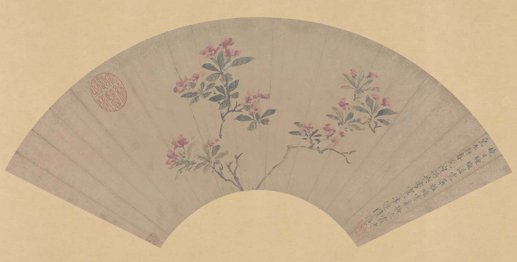 明代画家陆治创作的一幅扇面花鸟画,描绘了花卉题材,体现了明代文人画的审美趣味。