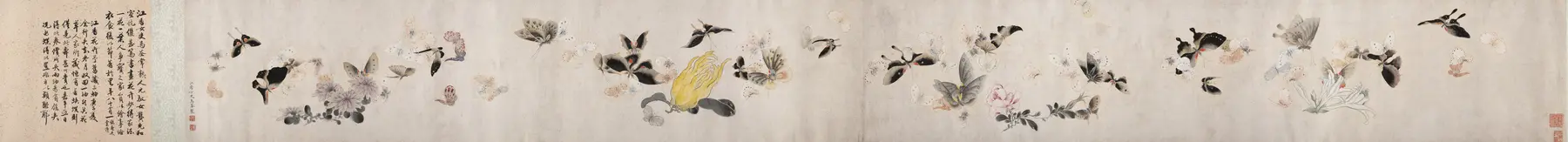 这幅手卷以花卉和蝴蝶为主题,展现了清代花鸟画的细腻风格。欣赏时可以关注画卷的横向展开方式,体会不同花卉与蝴蝶之间的自然组合与生动姿态。