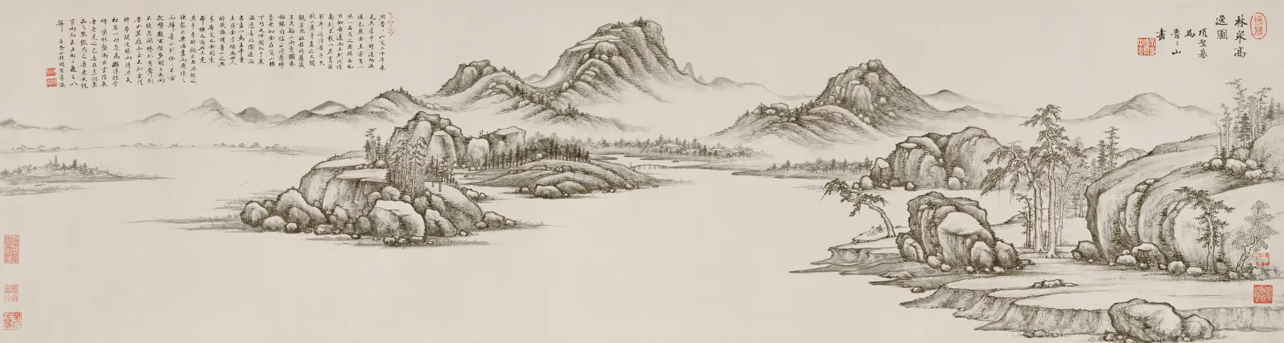 欣赏这幅作品时,可关注其手卷形式的独特观看体验:从右至左缓缓展开,逐步领略山水景致的变换。注意画家如何通过疏密的布局和虚实对比,营造出深远的空间感和宁静的氛围。作品中的笔墨运用体现了文人画的审美追求,淡雅而富有韵味,适合静心品味。