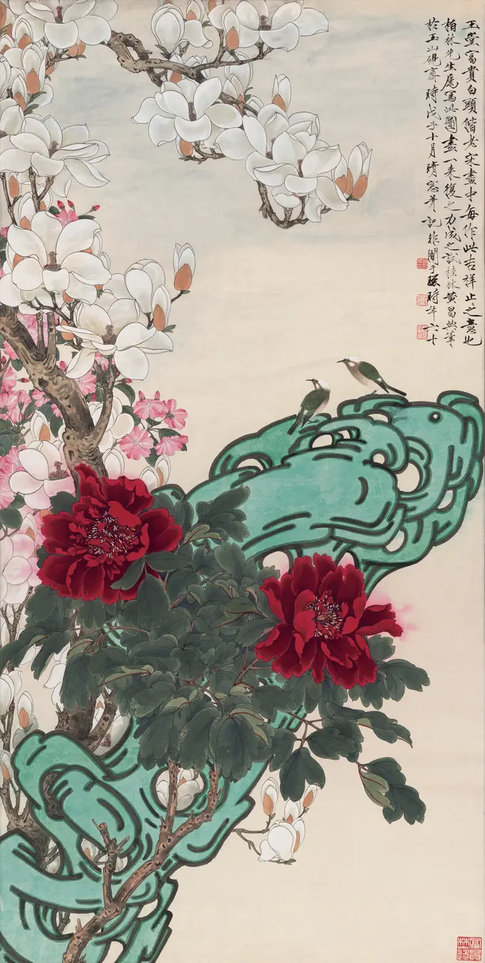 《玉堂富贵图》是于非闇创作的工笔花鸟画,以玉兰、牡丹等花卉为主题,寓意吉祥富贵,体现了其精湛的工笔技法。