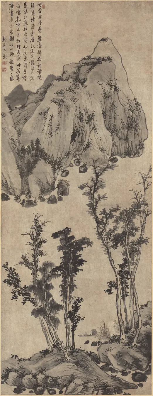 这幅作品以水墨描绘山水,展现了传统中国画的笔墨韵味。欣赏时可关注其整体的山水布局和墨色的浓淡变化,体会画家通过简练的笔触所营造的自然意境。