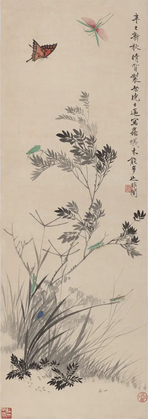 于非闇创作的工笔花鸟画作品,描绘新秋时节的窗前景物。