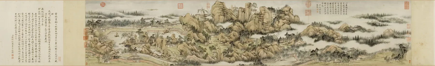 这是一幅清代山水长卷,您可以欣赏其横向展开的宏大构图,感受画家对连绵山林的描绘。作为手卷,建议从左至右缓缓展开观赏,体验画卷逐步呈现的山水意境。