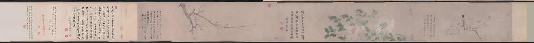 采用手卷横向展开的构图方式,画面分段呈现不同的花鸟组合,整体布局疏密有致,视觉流向从左至右自然过渡。