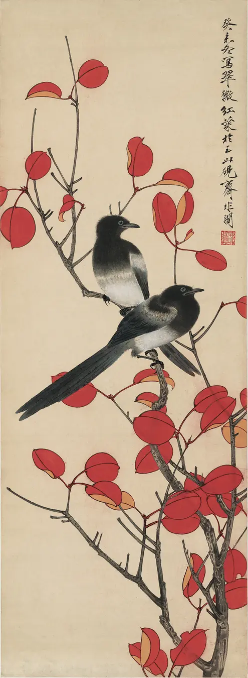 于非闇创作的纸本设色花鸟画立轴作品,描绘了翠微山色与红叶的景致。