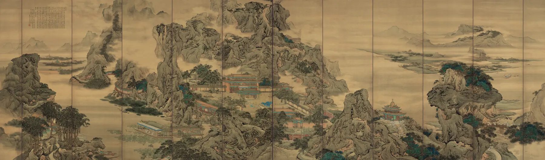 清代画家袁江创作的界画作品,以传说中的秦代阿房宫为主题,结合山水与建筑,展现了宏伟的宫殿景观。