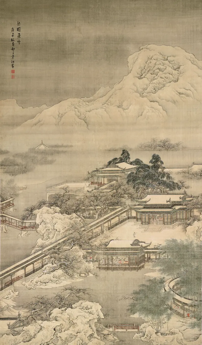 袁江是清代著名界画家,以描绘富丽堂皇的宫殿楼阁和园林建筑闻名。此画描绘汉代梁孝王刘武的梁园雪景,是其界画代表作之一。
