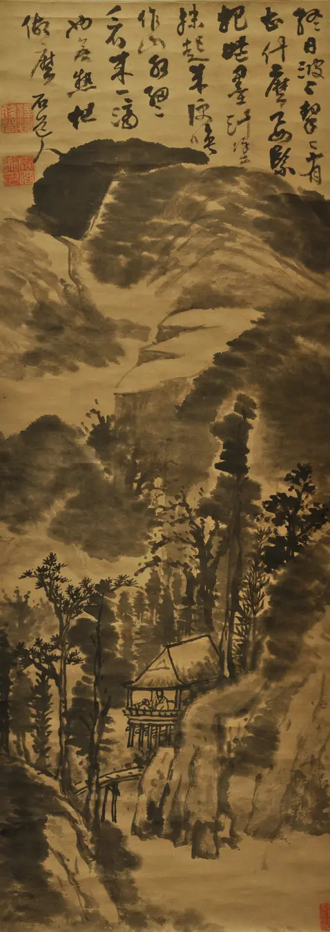 欣赏这幅画时,可先整体感受其泼墨技法带来的墨色淋漓与气势。注意观察山石的肌理如何通过泼墨表现,以及墨色的浓淡变化如何营造出空间层次与云雾效果。体会画面中幽深静谧的意境,以及髡残笔法的苍劲有力。作为立轴作品,可沿纵向视角欣赏山体的延伸与构图节奏。