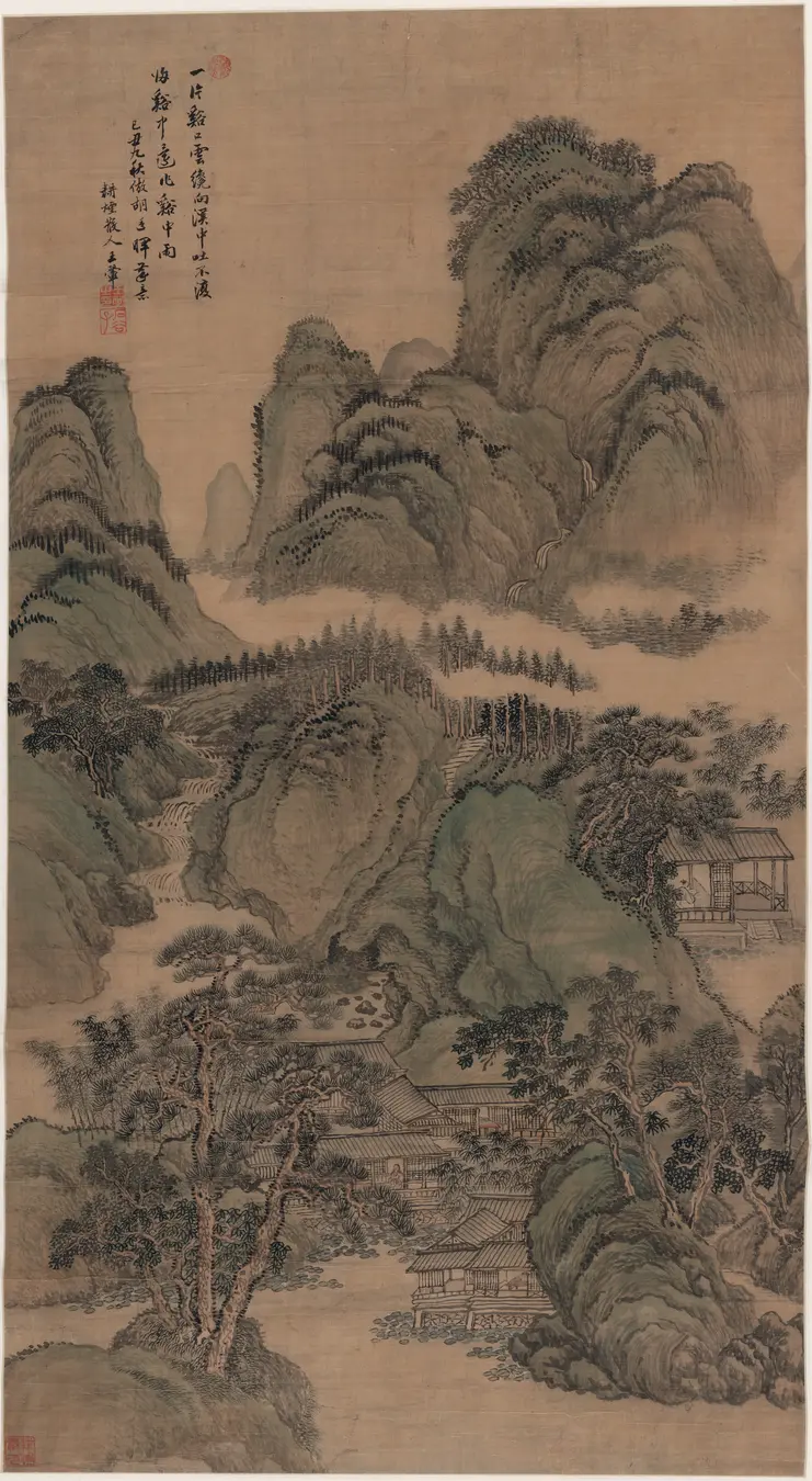 继承宋元山水画传统,笔墨技法严谨,设色清雅,构图注重山水层次与空间感。
