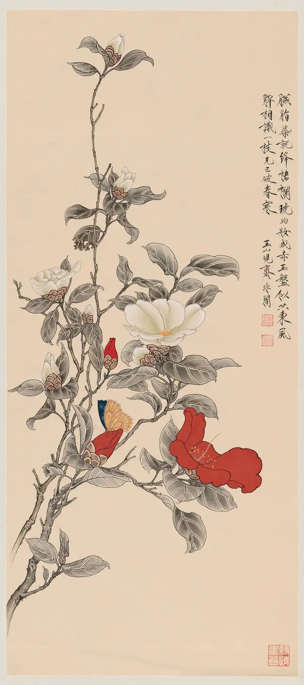 于非闇创作的工笔花鸟画,描绘红白两色茶花。