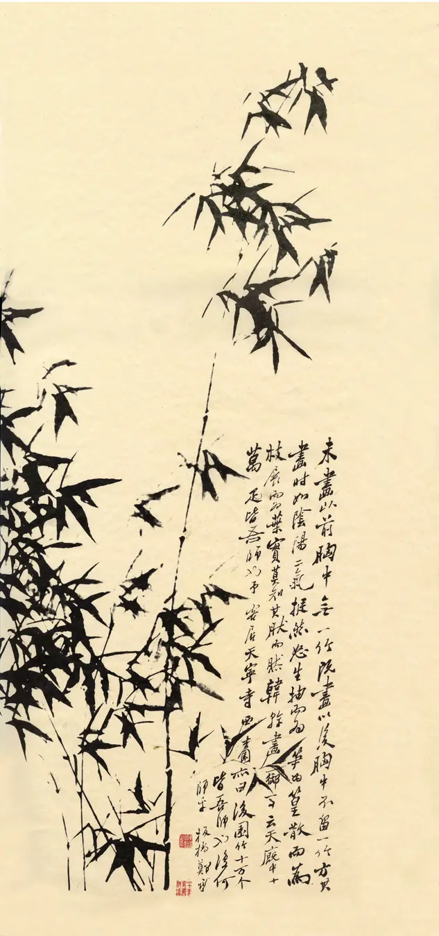 画面以竹子为主体,采用纵向构图,通过竹竿的穿插和枝叶的分布形成疏密对比。整体布局注重虚实关系,留白处营造出空间感。